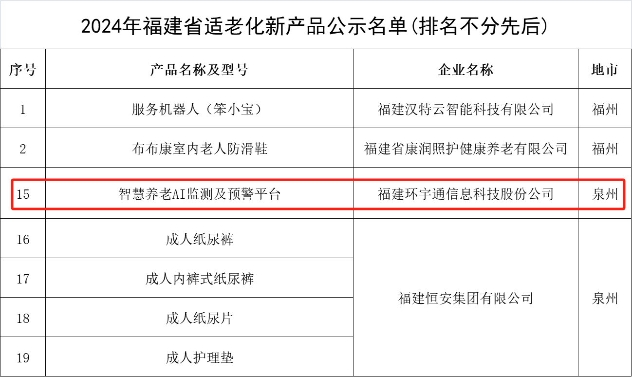 2024年11月19日,2024年福建省适老化新产品公示名单公布,全省有24款产品位列名单,泉州共有五款产品入选。其中九州酷游依托技术积累和创新能力所推出的“智慧养老AI监测及预警平台”入选该名单。这一荣誉不仅是对公司在“AI+医疗康养”领域的长期努力和贡献的肯定,更是对未来持续创新与高质量开展的激励。